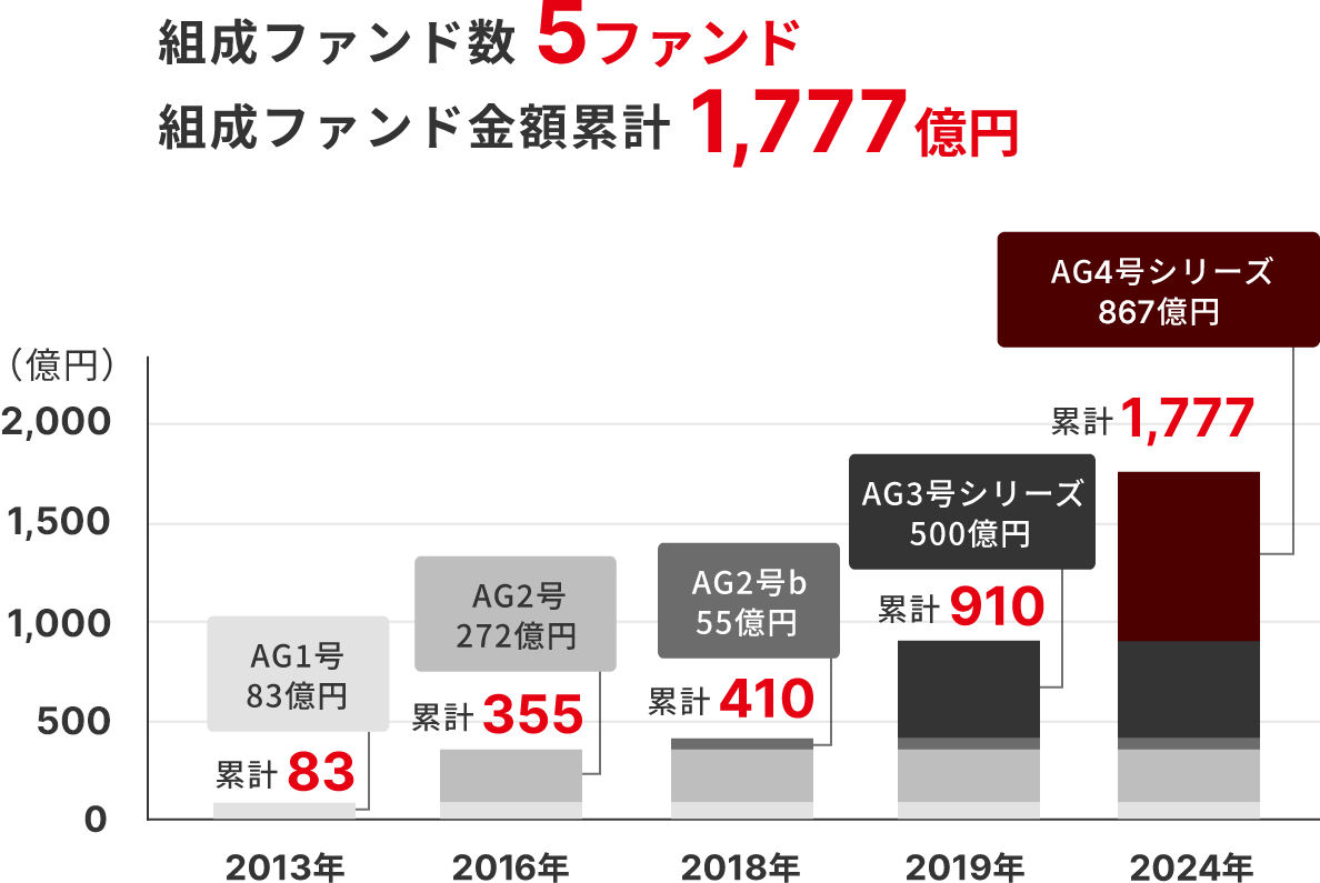 - ※1 AG2号: 2016年に当初100億円で組成し、追加募集の結果、2017年に272億円となった。