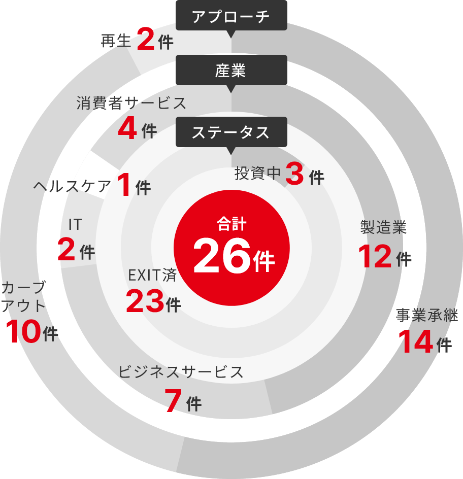 投資実績合計26件のアプローチ別、産業別、現在のステータス別の分類を記載しております。