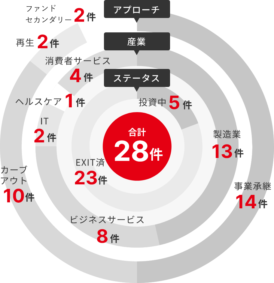 投資実績合計28件のアプローチ別、産業別、現在のステータス別の分類を記載しております。